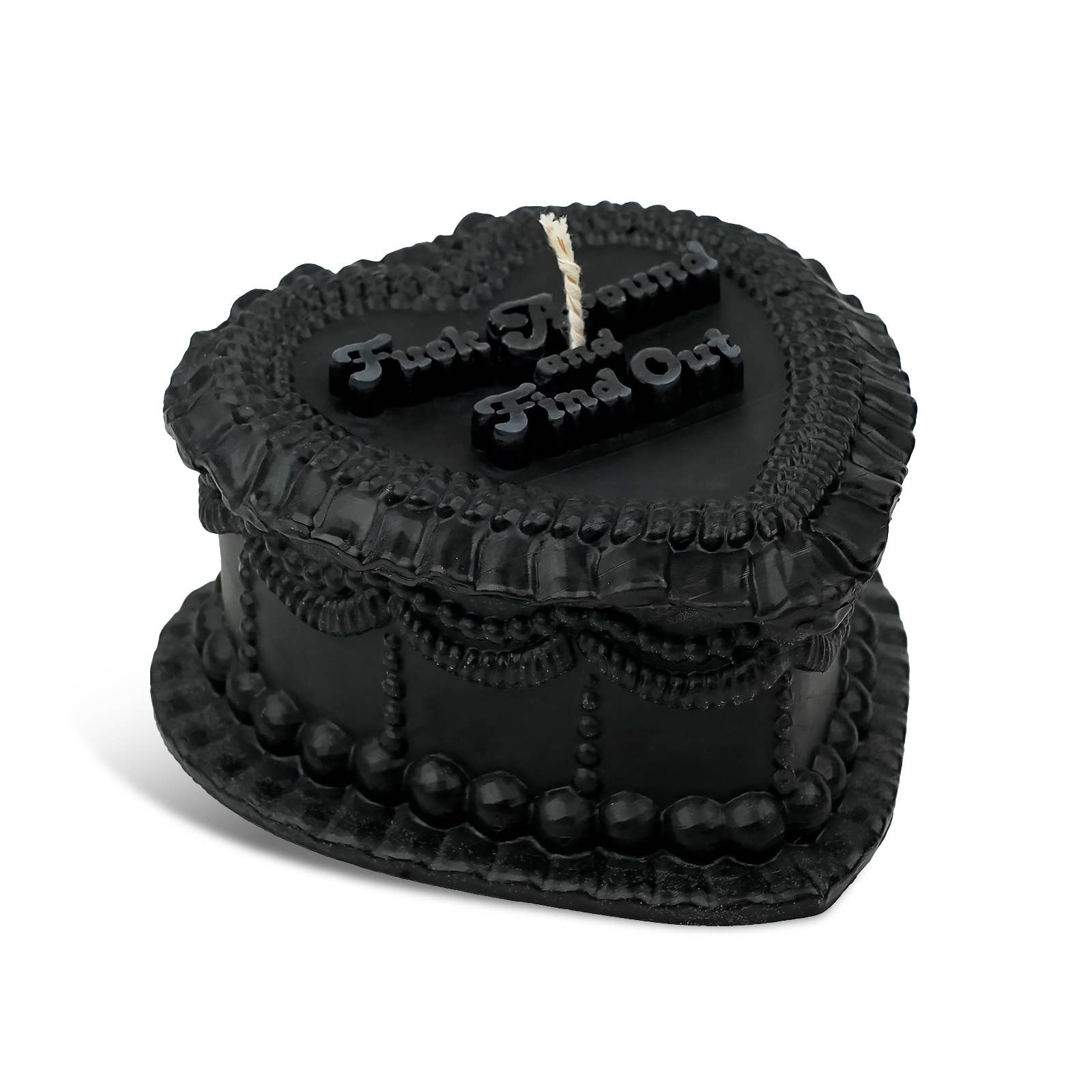 We loooove this black on black for the subtle "Fuck around and find out" message. This insanely cute candle is meant to mimic the appearance of a vintage heart-shaped cake. You know the ones, covered in frosting, over the top. This shape and saying is completely unique and one of a kind to us. We designed the mold from scratch, so these aren't available molds that anyone can make! These candles are big, unscented, and meant to make an adorable and hilarious statement. Each candle comes in a super cute box, and all boxes complement each other for a super cute and easy merchandising experience. Soy wax blend- candle measures 4.5" x 4.5" x 2.
