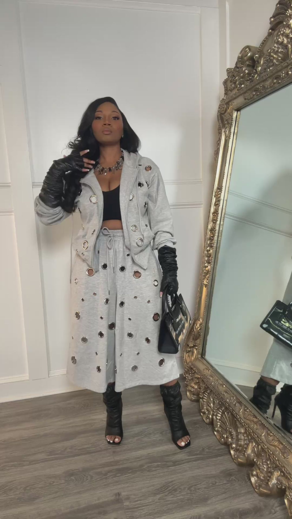 When ordinary won’t cut it. This bold two-piece set features oversized grommet detailing that brings edge to your everyday luxe. The soft grey fabric balances the statement hardware, making it perfect for both chill days and boss moves. Style it with heels or sneakers — either way, they’ll know you’re built different.