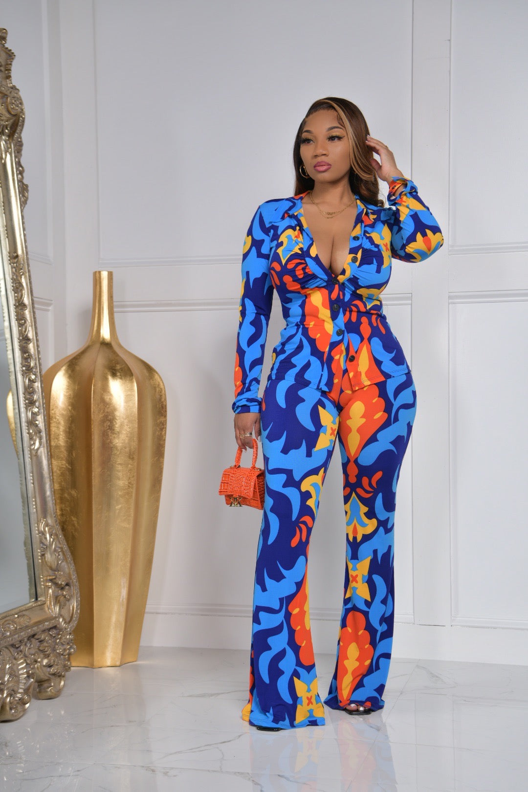 Bright, bold colors enhance this two piece set for the fearless and independent woman. Not your standard shirt top because you understand the style of minimal fluting that's creating a flirtatious effect. the top has button closures down the front and at the wrist. The flared pull-on pants match the top perfectly.