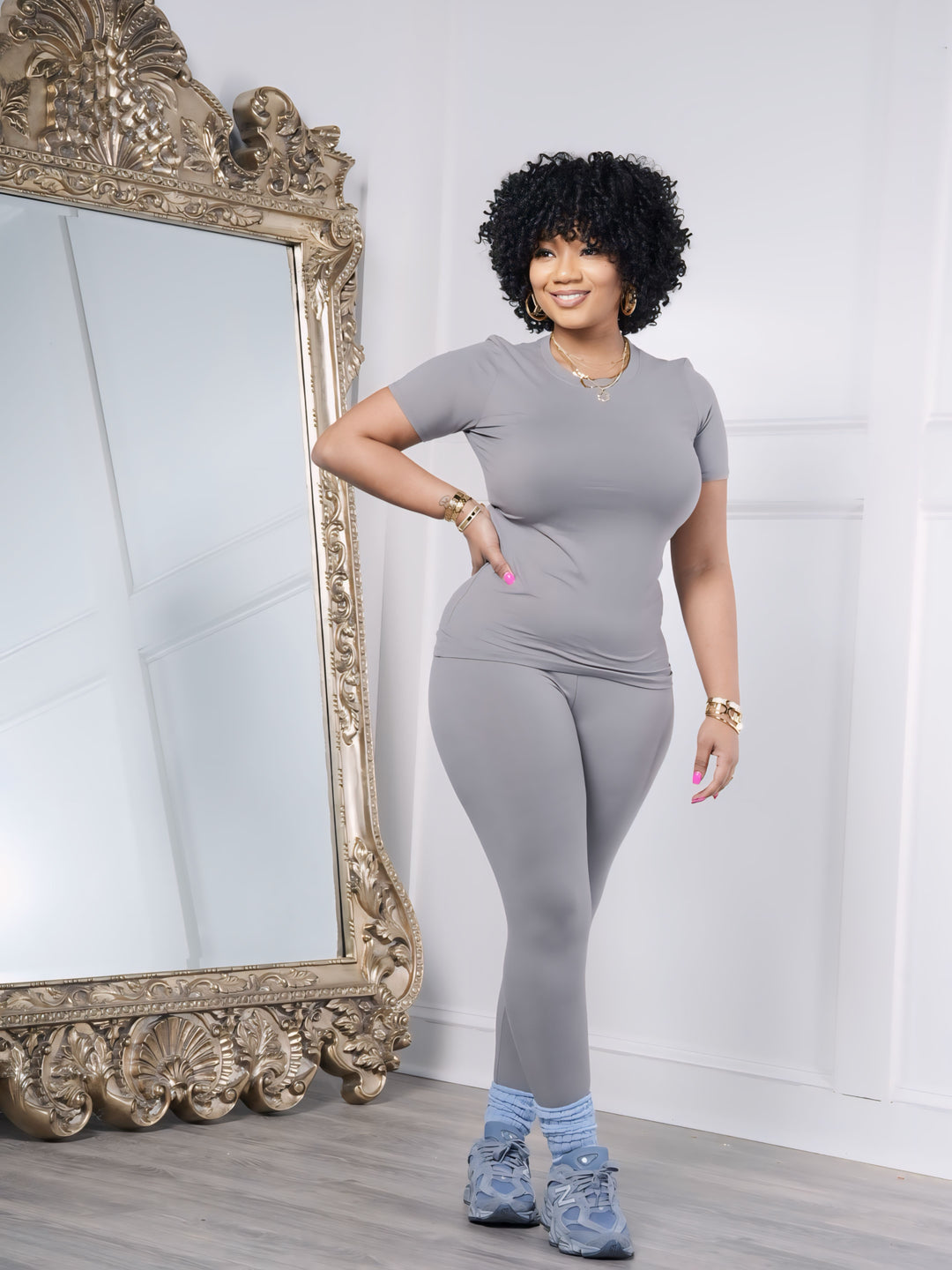 This 2-piece set is perfect for anyone with an active lifestyle. The buttery soft material feels great on your skin and features a round neck, fitted brushed t-shirt top, and leggings with an elastic waistline (available in inseams of 27" for small to 28 1/2" for large). With amazing stretch and a comfortable fit, Kleaux confidently wears a small in this 95% polyester, 5% spandex set. Don't miss out on this one!