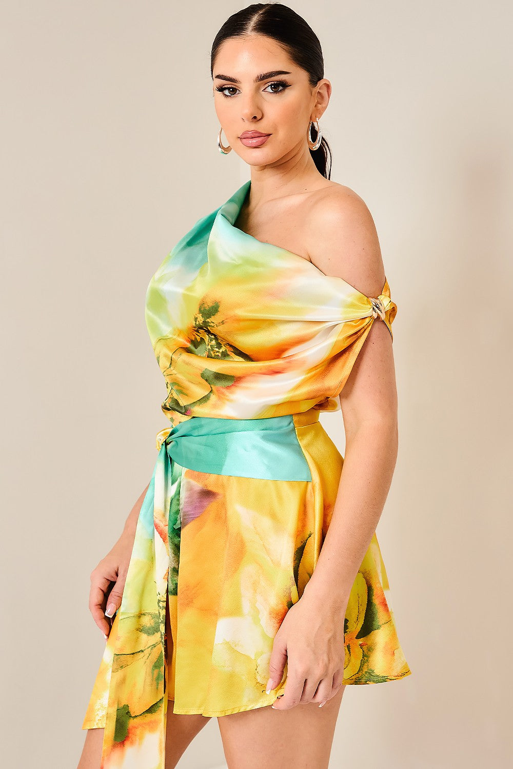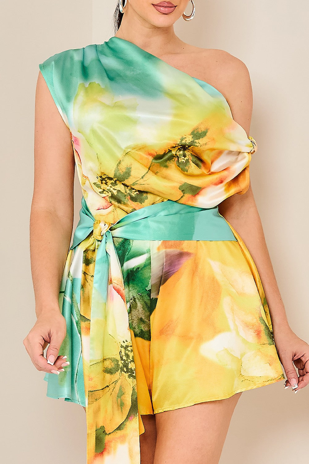 Slip into warm weather style and comfort in this draped, asymmetrical shoulder romper. This stunner features a cowl neck with metal ring accents, a buttoned sexy open back with a lower back concealed zipper, front self tie detail and intimate lining all in a floral watercolor print.