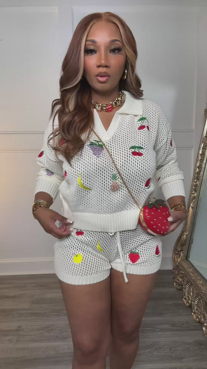 Sweet, stylish, and effortlessly playful — the Fruit Punch Knit Set is your go-to summer slay. This cream crochet-inspired knit features a relaxed long-sleeve top and high-waisted shorts with drawstring waistband , both sprinkled with vibrant embroidered fruit motifs for a juicy pop of color. Lightweight and breezy, it’s perfect for brunch dates, beach strolls, or poolside lounging.