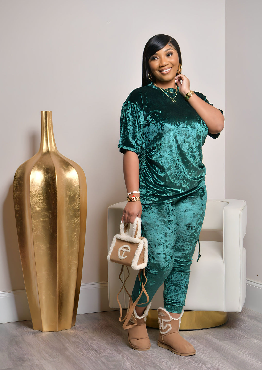 Cozy-chic crushed velvet defines this perfect two-piece set. The oversized short sleeve tunic top features drawstring sides that can be worn as a dress, while the high-waisted jogger style pants with elastic waist and pockets give the perfect fit. Don't miss out on the on-trend look that Kleaux sports--in a small size!