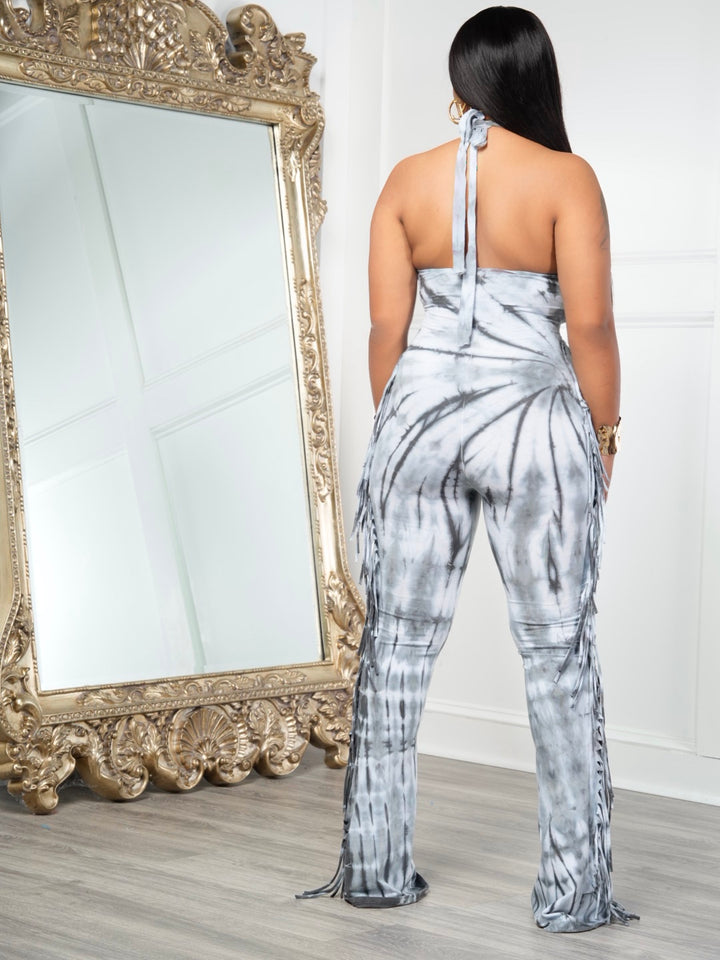 Coming or Going you'll make a statement in this Made-To-Move Jumpsuit. This tie dye halter jumpsuit features side fringe, a plunging neckline and low back.